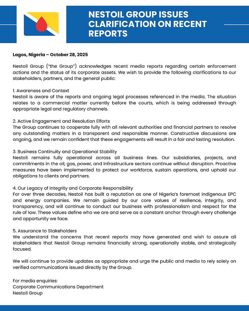 Nestoil Group (“the Group”) acknowledges recent media reports regarding certain enforcementactions and the status of its corporate assets.
